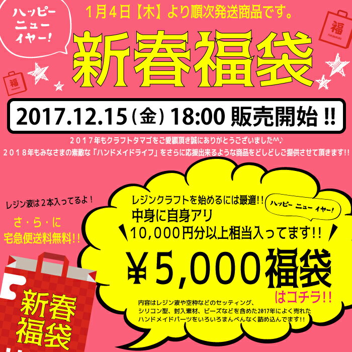価格: 5,400円 レビュー評価:4.22 レビュー数:9 仕 様2017年はCraft Tamagoをご愛顧頂き誠にありがとうございました^^♪2018年もみなさまの素敵な「ハンドメイドライフ」を応援出来るような商品をどしどしご提供させて頂きます!! 中身に自身あり!!Craft Tamagoの2018年新春5,000円福袋です!!(10,000円分以上入ってます♪) 内容はレジン液や空枠などのセッティング、シリコン型、封入素材、ビーズなどを含めた2017年によく売れたハンドメイドパーツをいろいろまんべんなく詰め込んでます♪宅配便送料無料でお届けします! 【ご確認ください】 ※当商品の発送は1月4日(木)より順次発送とさせて頂きます。当商品と一緒に他の商品もご注文頂いた場合、 福袋の発送(1月4日より順次)と同時の発送になりますので、ご注意ください。 ※より多くのお客様にお楽しみ頂ける様、5000円福袋は1点まで、500円福袋は2点までとさせて頂 (更新日時:2018/01/27 17:41) Supported by 楽天ウェブサービス |